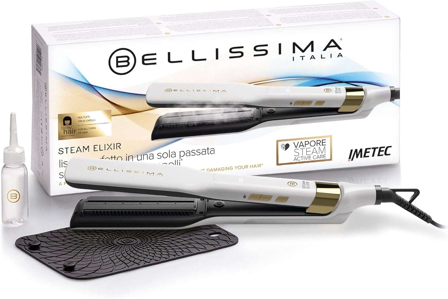 La piastra Bellissima Steam Elixir di Imetec rappresenta la scelta ottimale per chi desidera ottenere capelli lisci e luminosi senza arrecare danni. Grazie all’innovativa tecnologia a vapore Steam Active Care, questa piastra rilascia un flusso costante di vapore che, durante lo styling, idrata e protegge i capelli.