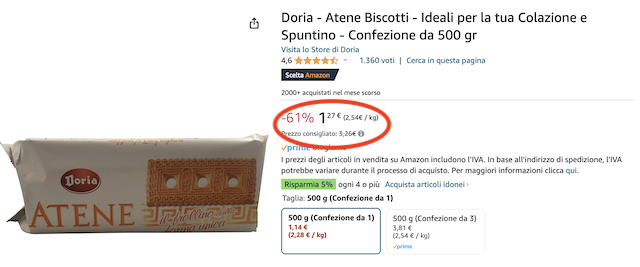 Biscotti Doria Atene, 500 grammi, a 1,27€ (sconto 61%).