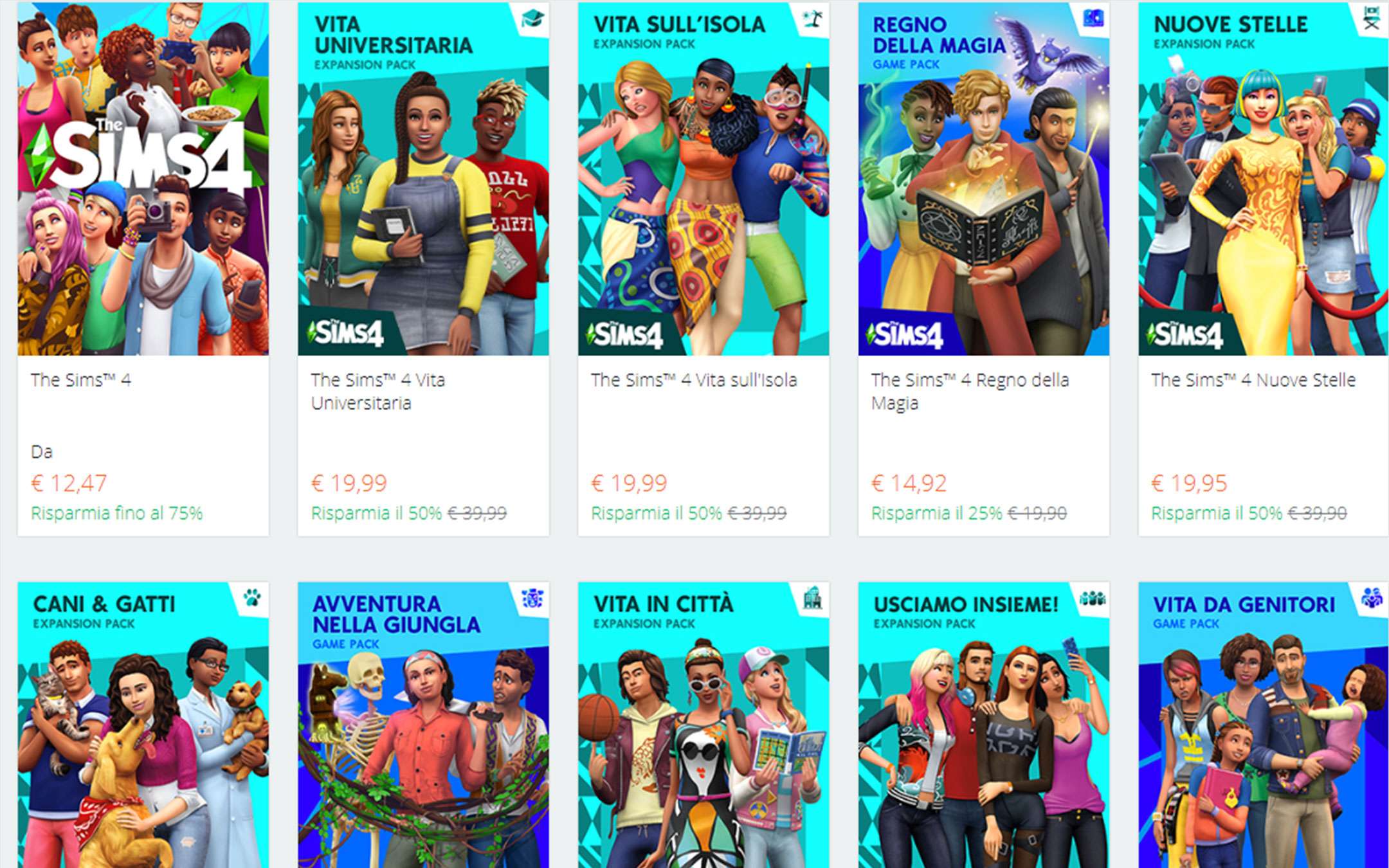 Dando un’occhiata ai prezzi, “The SIMS 4” costa adesso solo 12,47€, grazie a uno sconto del 75%. Per rendere più interessante le sessioni di gioco, aggiungete un po’ di pepe con un’espansione: ce n’è per tutti i gusti e si parte da meno di 5€. I prezzi variano naturalmente sulla base del costo iniziale e della percentuale di sconto praticata.