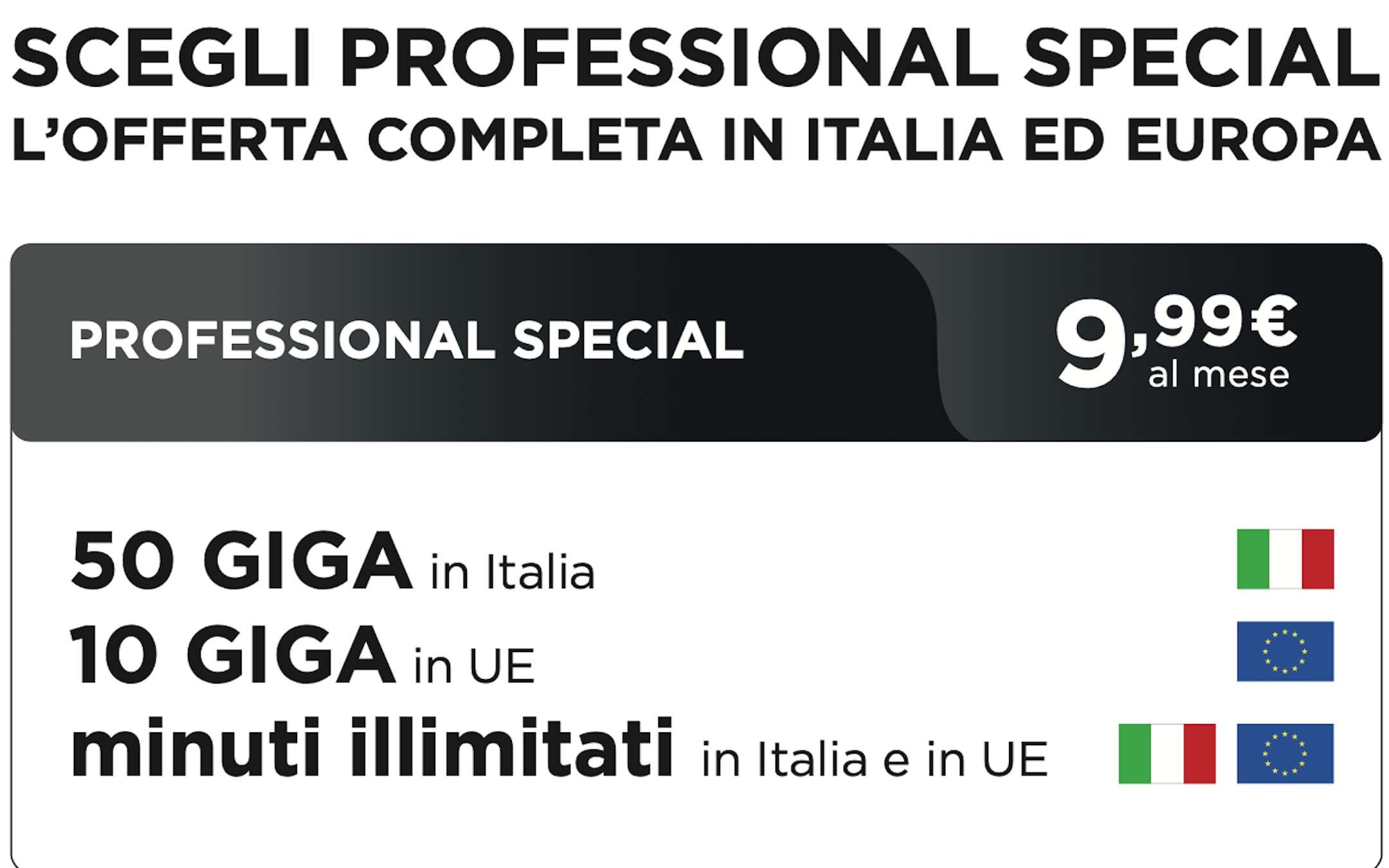 La Professional Special ha un costo di attivazione di 5€ che viene addebitato alla prima fattura utile. Oltre all’entry fee, la prima volta è previsto il pagamento della SIM di 10€ con 4€ già inclusi nel credito residuo.