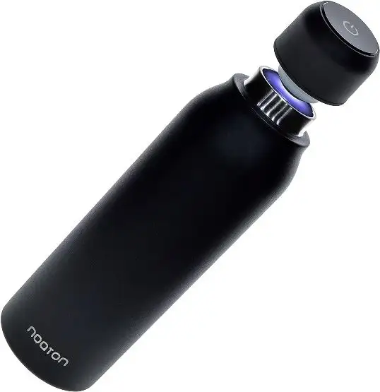 Sterilizzazione con raggi ultravioletti a prezzo più contenuto con la borraccia termica Naturaq di Noaton, che, come visto nel caso della bottiglia Philips, contiene una luce UVC nel tappo per disinfettare l’acqua e le pareti della borraccia. L’intervallo per la sterilizzazione automatica è di 6 ore, e la batteria si ricarica attraverso una porta USB-C posta sul lato del tappo.