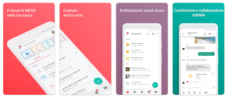 Con l’app di MEGA otterremo 20 GB di spazio d’archiviazione gratuito, crittografia end-to-end di livello militare, sistema di condivisione e collaborazione criptata, una chat privata con cui comunicare senza intercettazioni e il sistema per sincronizzare le foto e i video presenti nella galleria del telefono.