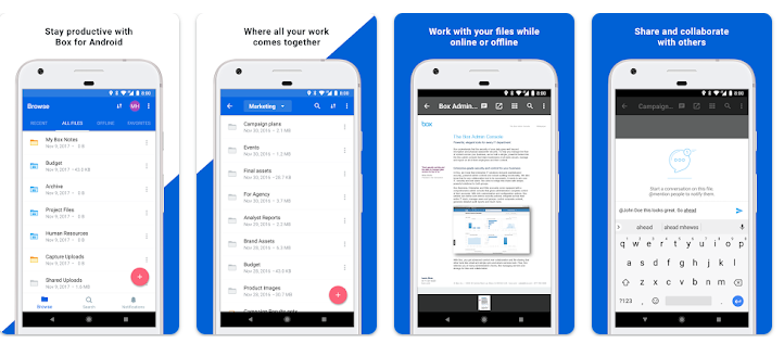 A livello aziendale uno dei cloud più diffusi è Box, che possiamo integrare sul nostro telefono Android direttamente dal Google Play Store (oltre che su tutte le piattaforme supportate).