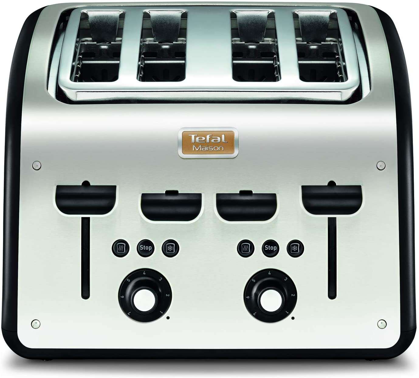 Per famiglie più numerose o semplicemente per tostare più fette allo stesso tempo Tefal propone un tostapane a 4 slot con due controlli separati a coppia, così da poter scegliere livelli diversi di tostatura in base ai gusti di ognuno. Possiamo scegliere fra 7 livelli di potenza, con un valore massimo di 1700W, e al termine del processo di tostatura le fette verranno espulse automaticamente ad un’altezza da cui possiamo prenderle senza scottarci. In basso abbiamo poi due vassoi removibili per raccogliere le briciole.