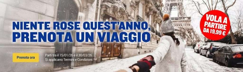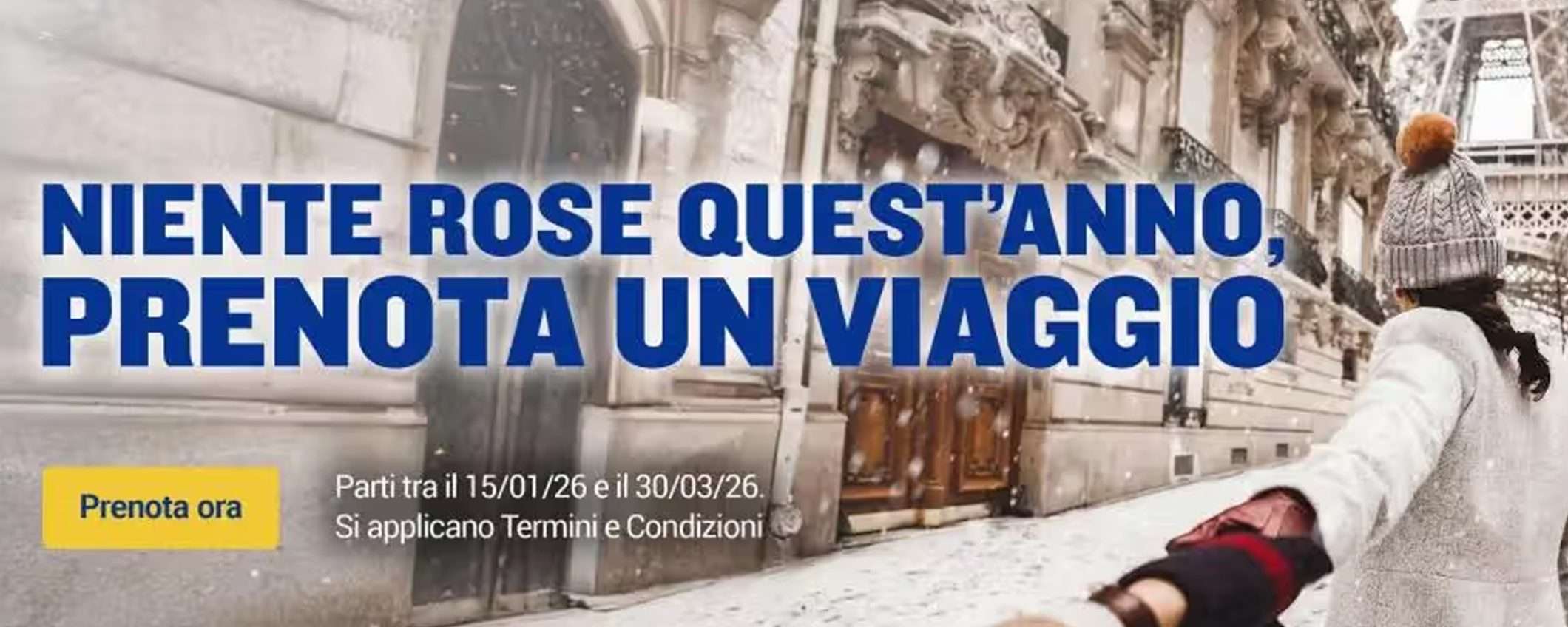 Dimentica le rose per questo San Valentino: un biglietto aereo è il regalo più sorprendente e oggi anche più conveniente. Grazie alla nuova promozione Ryanair puoi volare a partire da 19,99 euro verso le più belle destinazioni italiane ed europee. Hai tempo fino al 15 febbraio per acquistare il tuo biglietto, per viaggi fino al 30 marzo.