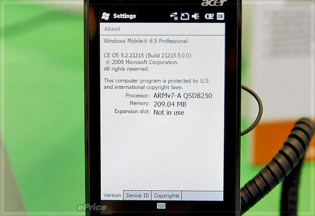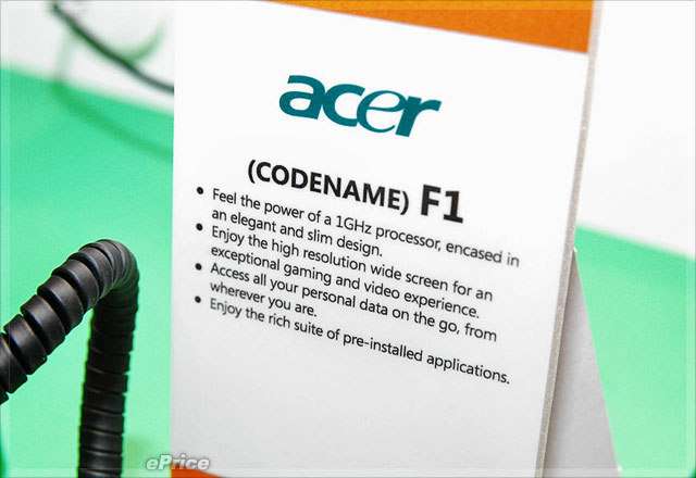 Acer F1 vanta un chip Qualcomm Snapdragon da 1GHz, un ampio schermo touchscreen da 3.8 pollici TFT con una risoluzione di 480 x 800 pixel, connettività HSDPA e Wi-Fi, ricevitore GPS integrato, Windows Mobile 6.5 Professional, jack standard da 3.5 mm per le cuffie, radio FM e fotocamera da 5 megapixel con flash LED. Acer F1 dovrebbe essere disponibile sul mercato a settembre, probabilmente con un altro nome dal momento che F1 è un nome in codice.