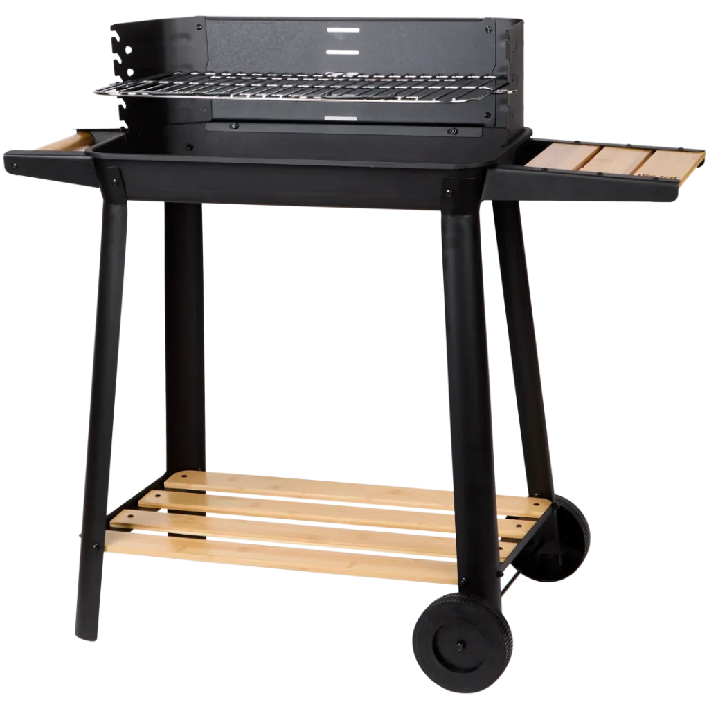 Il barbecue misura 85,5 x 41,5 x 78 centimetri e dispone di ripiani in legno, con griglia di cottura e spazio di stoccaggio (ad esempio per poggiare tutti gli accessori necessari). Inoltre, è dotato di due ruote che lo rendono davvero semplice da trasportare.