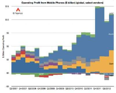 Il cambiamento più evidente è dato dalla quota riguardante l'utile operativo di Apple che, come ipotizzabile, è scesa al 60% nel corso del 3° trimestre del 2012. Ma la società di Cupertino ha lanciato il suo nuovo iPhone 5 proprio alla fine del trimestre ed è quindi ipotizzabile un miglioramento nel corso del 4° trimestre. La quota di Samsung è invece cresciuta notevolmente grazie alle ottime vendite della sua serie di smartphone Galaxy ed ha raggiunto il 39% dei profitti del mercato.