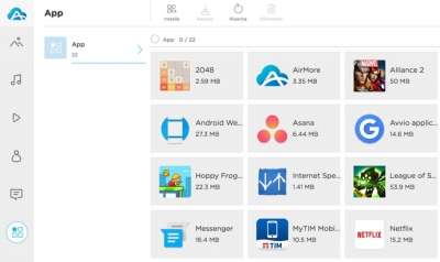 Pochi secondi e accediamo automaticamente alla schermata principale di AirMore. La cosa che salta subito all’occhio è la pulizia dell’interfaccia, decisamente user-friendly. Sulla sinistra troviamo le icone con le funzionalità, al centro le informazioni sul dispositivo collegato.