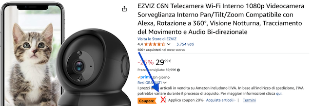 Telecamera WiFi Ezviz con sistema di rotazione motorizzato, gestibile da smartphone, a 23,99€.