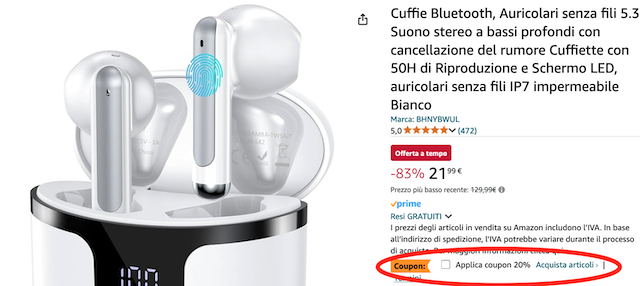 Auricolari Bluetooth 5.3, fino a 50 ore di autonomia energetica, a 17,59€ (attiva il coupon in pagina, come nell’immagine d’esempio posizionata subito sopra. Lo sconto totale è dell’86%).