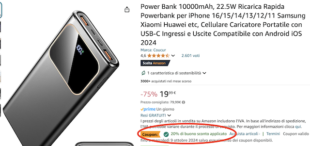 Powerbank da 20000 mAh con supporto alla ricarica rapida da 22,5W a 20,99€ invece di 36,99€.