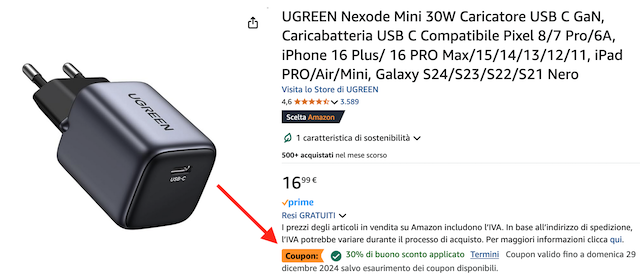 Caricatore rapido UGREEN da 30W a 11,89€.