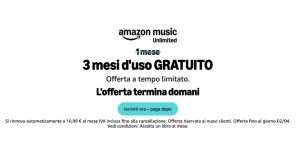 La promozione è riservata ai nuovi clienti e non è cumulabile con altre offerte. È limitata a un solo cliente e account ed è utilizzabile una sola volta. Al termine dei tre mesi gratuiti, l’abbonamento si rinnova automaticamente a 10,99 euro al mese IVA inclusa, salvo cancellazione. La promozione è valida fino al 2 aprile, e rappresenta un’occasione interessante per provare tutte le funzionalità premium del servizio senza costi iniziali. Per provare gratuitamente Amazon Music clicca qui.