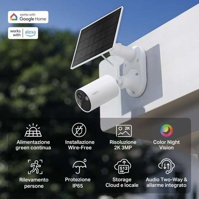 Tapo C140, videocamera di sicurezza da esterno con batteria ricaricabile e pannello solare, a 49,99€.