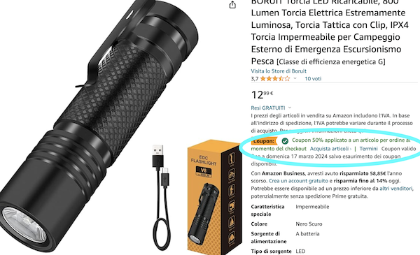 ATTENZIONE: l’unico modo per usufruire dello sconto del 50% e quello di attivare il coupon promozionale direttamente all’interno della pagina del prodotto.farlo è semplicissimo, come mostrato nella seguente immagine d’esempio.