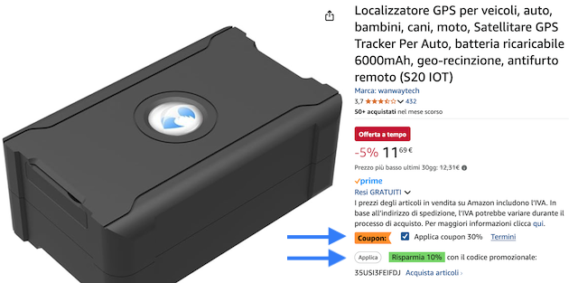 Localizzatore GPS con SIM integrata e batteria ricaricabile a 6,59€ (spunta il coupon in pagina e inserisci il codice ” 35USI3FEIFDJ ” prima di pagare).