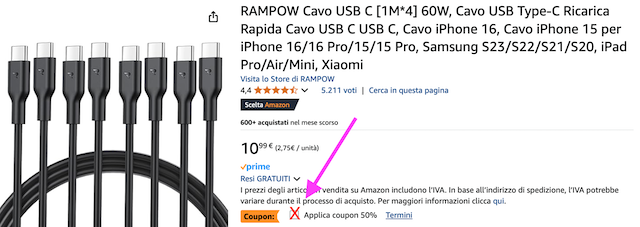Lasciati travolgere da questi incredibili sconti del 50%, tutti disponibili in questo momento su Amazon. Puoi accaparrarti prodotti di ogni genere, a prezzo piccolissimo! Per accedere alle promozioni, devi semplicemente attivare l’offerta in pagina come nell’immagine d’esempio seguente.