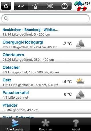 SkiResort mostra le condizioni della neve, la qualità della neve, il tempo, gli impianti di risalita aperti ed i chilometri di piste preparate per più di 650 località sciistiche nel mondo.
