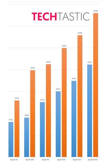 Il chipset ha raggiunto 4.236 punti nel test single-core e 6.588 nel test multi-core. Ricordiamo, giusto come termine di paragone, che il chipset A10 – attualmente utilizzato su iPhone 7 e iPhone 7 Plus – aveva fatto segnare punteggi di 3.490 (single-core) e 5.580 (multi-core). L'Apple A9x, che viene impiegato sull'iPad Pro, aveva invece fatto segnare 3.010 e 4.990 punti.