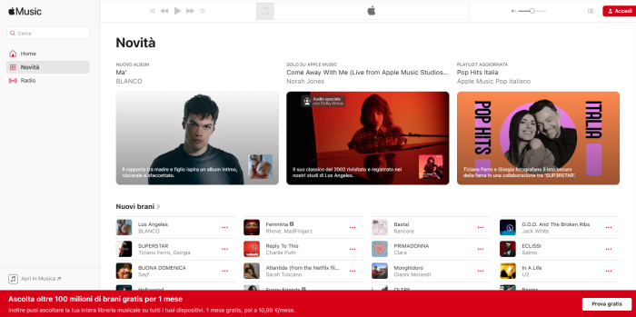 Una volta completata la configurazione hardware, non resta che andare sull’app di Apple Music: l’offerta apparirà in automatico all’apertura. Se non dovesse succedere, non bisognerà fare altro che andare nella Home Page e toccare il pulsante “Accetta Ora” per dare inizio alla prova gratuita.