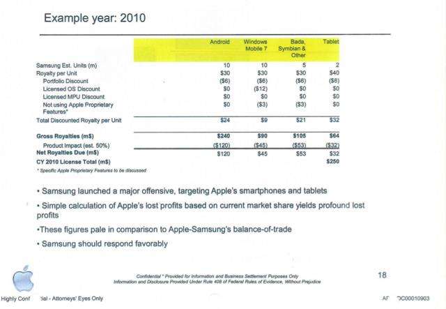 Secondo Apple, qualora avesse accettato, Samsung avrebbe dovuto pagare circa 250 milioni di dollari per il 2010, meno di quanto Apple gli aveva pagato per l'acquisto di componenti.