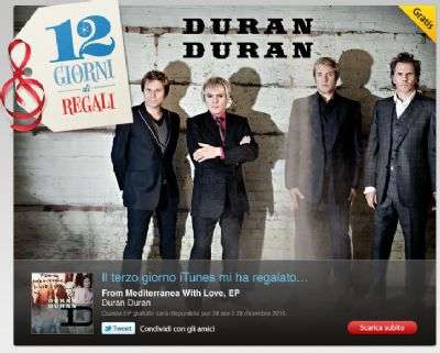Terzo giorno di regali da parte di Apple. L’applicazione "12 giorni di Regali iTunes" torna a regalare musica con i Duran Duran.Pronti da scaricare gratuitamente ci sono tre brani del gruppo inglese tra cui l'inedito Mediterranea tratto dall'ultimo album "All You Need Is Now" e due brani "live", i successi Ordinary Word e Reach up for the Sunrise.