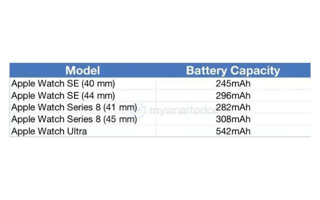Gli orologi sono stati avvistati all’interno del database cinese 3C; in primo luogo, scopriamo che Apple Watch Ultra, il super device con cassa in titanio da 49 mm, presenta una batteria da 542 mAh che garantisce giorni di autonomia (36 ore che possono diventare 60 con la nuova modalità di risparmio energetico) con una singola carica. Watch SE da 40 e 44 mm invece, presentano degli accumulatori da 245 e 296 mAh. Invece, il Watch Series 8 da 41 e 45 mm ha batterie da 282 e 308 mAh, rispettivamente.