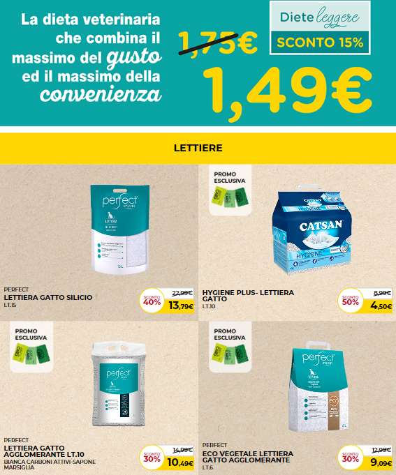 Ottimo prezzo anche per la lettiera Catsan Hygiene Plus da 10 litri, a metà prezzo (soltanto 4,50 euro), oltre a diverse varietà di cibo umido: per cani, Hill’s da 370 grammi a 2,23 euro (30% di sconto), Monge da 400 grammi a 1,19 euro (40% di sconto) e multipack Cesar in salsa a 12,59 euro (30% di sconto) per 24 bustine; per gatti, multipack lattina Gourmet Gold a 9,77 euro (-40%), Hill’s a 85 centesimi per busta (-50%) e Royal Canin, in promozione con 4 buste da 85 grammi in omaggio, acquistandone 8.