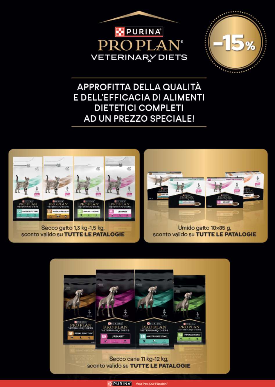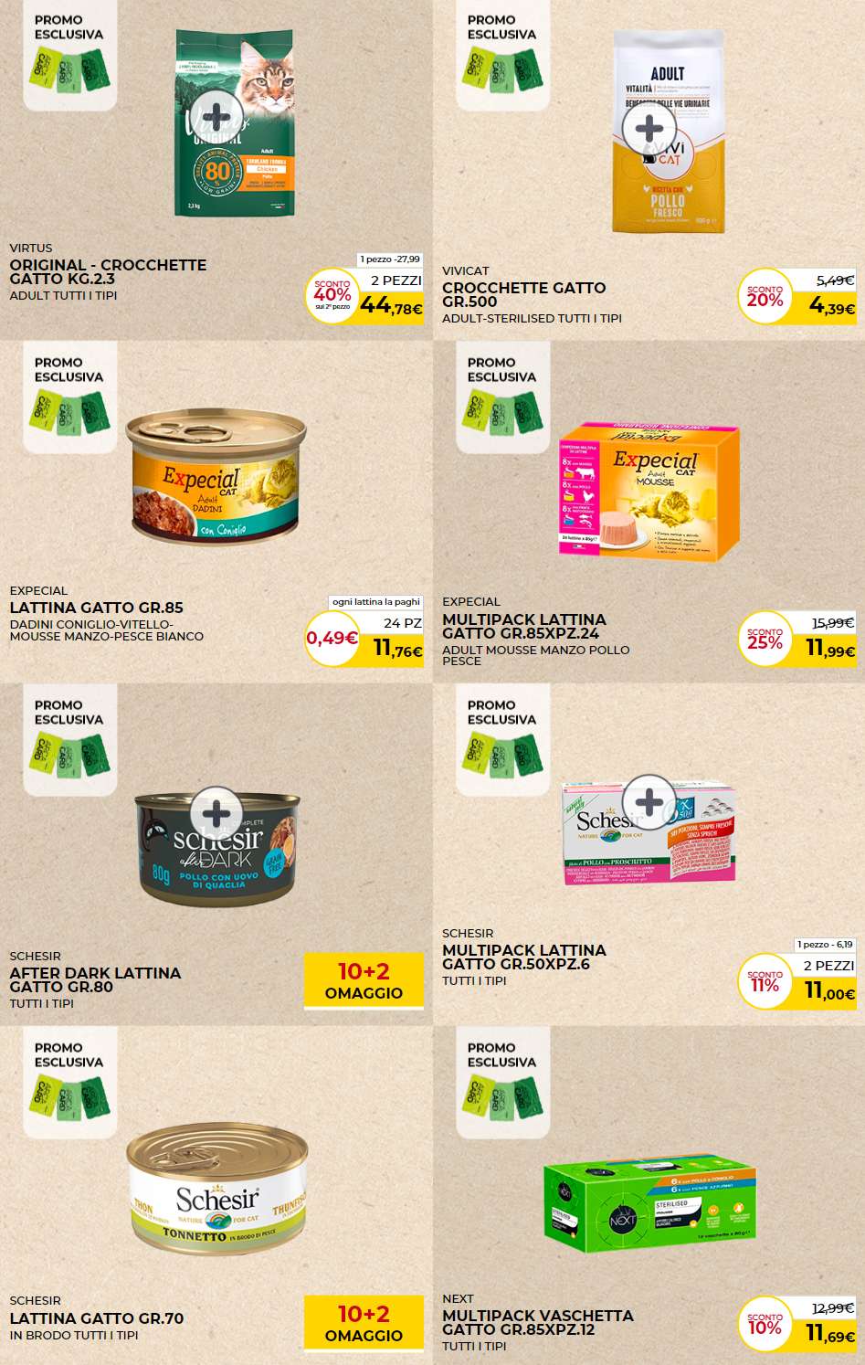 Le categorie di prodotti variano: prevalgono cibo secco e cibo umido, ma non mancano anche mangimi dietetici specifici, snack, lettiere per gatti, prodotti per l’igiene, antiparassitari e curativi, toilette e accessori per cani e gatti.