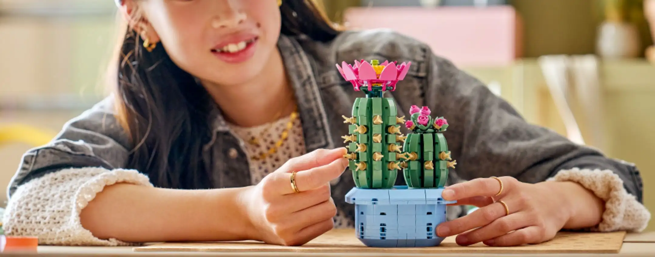 Il set LEGO è composto da 482 pezzi e permette di costruire ben due cactus artificiali, ognuno con una personalità diversa: uno più grande, completamente in fiore, e uno più piccolo con boccioli in varie fasi di crescita. Il cactus principale sfoggia un fiore rosa con dettagli gialli, luminoso e delicato, mentre il cactus più piccolo presenta boccioli rosa.