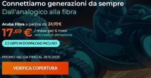 La connessione lenta è ormai un ricordo: con Aruba Fibra puoi navigare alla massima velocità, affidandoti a una rete stabile e conveniente. L’offerta parte da 17,69 € al mese per i primi sei mesi, senza costi extra di attivazione, e mette a disposizione una connessione FTTH fino a 2,5 Gbps in download.