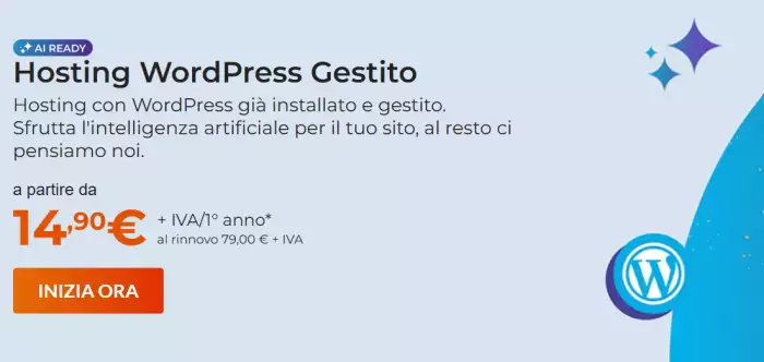 Chi sta valutando la creazione di un sito WordPress trova in Aruba una proposta pensata per partire subito con basi solide. L’hosting dedicato parte da 14,90 euro + IVA per il primo anno invece di 79 euro e offre un ambiente già configurato, con WordPress preinstallato, strumenti avanzati per la sicurezza e un sistema di intelligenza artificiale capace di generare un sito funzionante in pochi minuti.