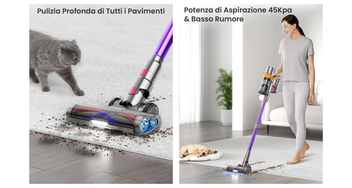 Questo aspirapolvere senza fili gode di una potenza da 550 W e un’aspirazione da 45 Kpa che ti permette di raccogliere tutto in una sola passata. Nulla sarà un problema, nemmeno i piccoli detriti. È in grado di passare agevolmente anche sui tappeti per una pulizia profonda. Inoltre è dotata di una spazzolata anigroviglio che garantisce una perfetta efficienza e una lunga durata.