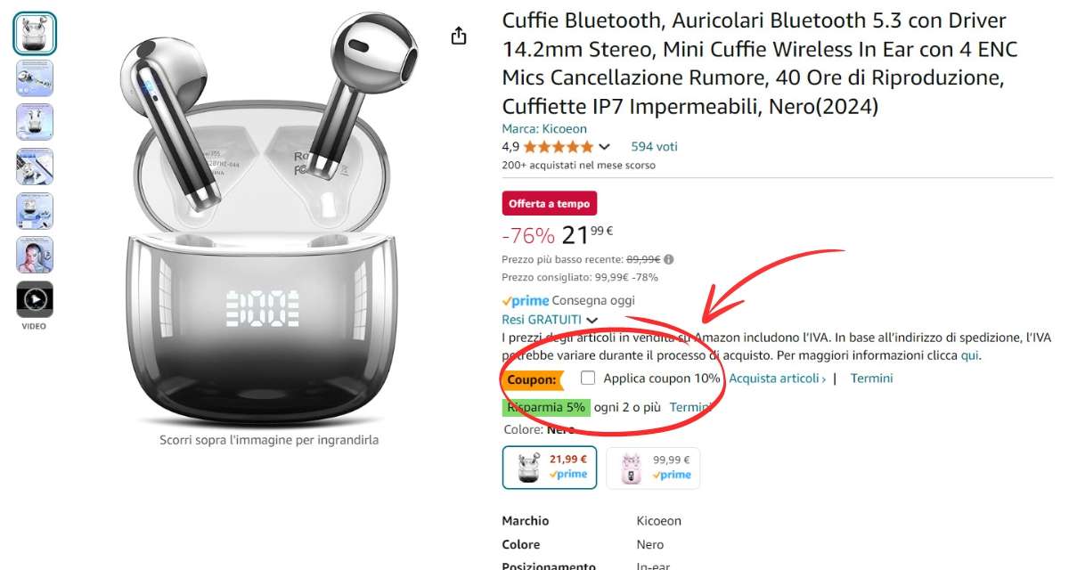 Sembra impossibile ma ti assicuro che è tutto vero. Forse potresti non visualizzarlo ma tieni presente che sul prezzo originale c’è uno sconto del 78% che sommato al ribasso del 10% con il coupon che permette di risparmiare la bellezza di oltre 80 euro. E potrai avere delle cuffiette Bluetooth davvero di ottima qualità.