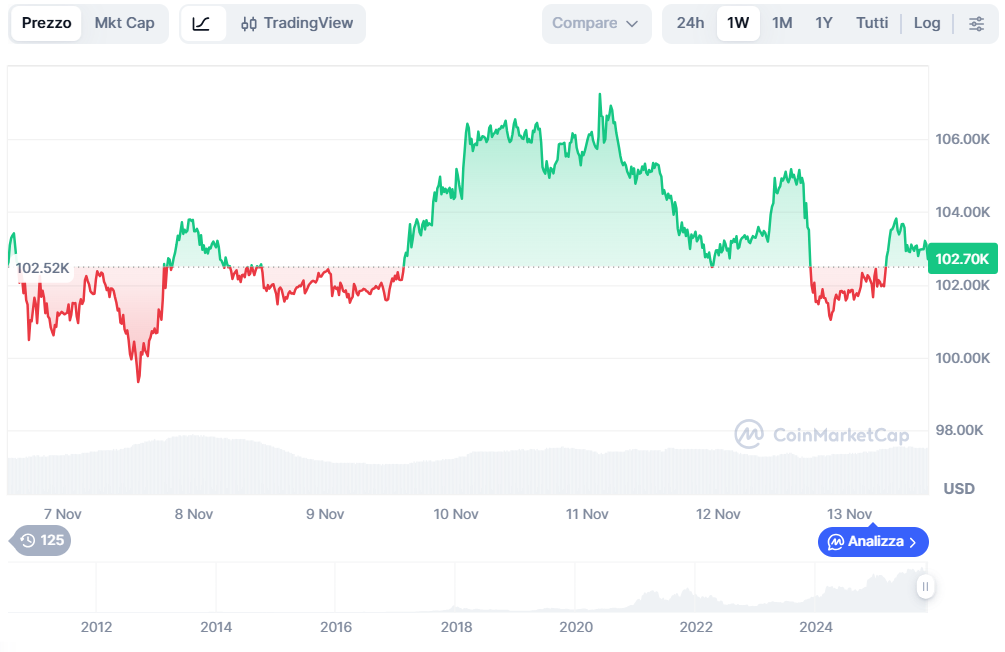 Infatti, mentre l’indice azionario statunitense e il metallo prezioso hanno continuato a registrare guadagni costanti, la criptovaluta più conosciuta ha subito un calo vicino al 7% in un mese, portandosi intorno ai 102.700 dollari.