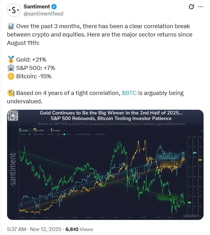 Dunque, l’analisi di Santiment suggerisce che la rottura non debba essere interpretata unicamente come un segnale di debolezza, ma come possibile indicatore di una fase di maturazione del mercato. La diminuzione di correlazione potrebbe riflettere: