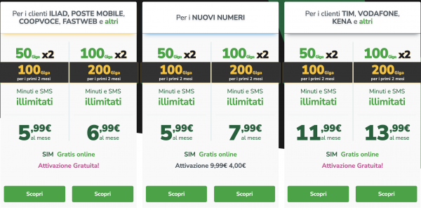 - Very 7,99: offre invece 200 Giga per il primo bimestre, minuti e SMS senza limiti verso tutti a 7,99 euro mensili.