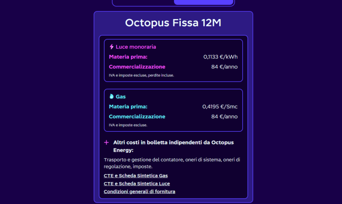 Con Octopus Energy hai la possibilità di scegliere un fornitore attento alla trasparenza, che ti accompagna anche dopo i 12 mesi aiutandoti a individuare la tariffa migliore in base alle tue abitudini di consumo. Una scelta ideale per chi vuole stabilità, chiarezza e un risparmio concreto. Per tutti i dettagli e per l’attivazione basta andare sul sito ufficiale del fornitore.