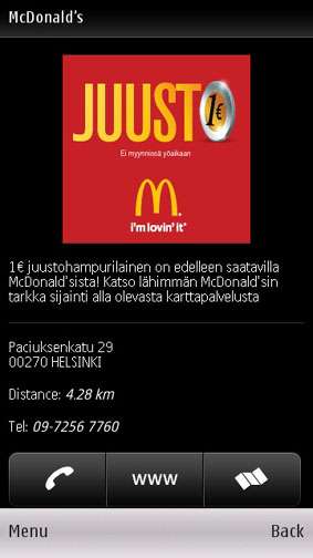 La campagna, basata su NAVTEQ LocationPoint Advertising, ha consentito a McDonald’s di inviare messaggi pubblicitari mirati rispetto alla posizione degli utenti Nokia Ovi Maps che si trovavano entro un determinato raggio da ognuno degli 82 ristoranti McDonald’s presenti sul territorio della Finlandia. La campagna pubblicitaria promuoveva il cheeseburger al costo di 1 euro e ha generato un ritorno sull’investimento consistente e misurabile, realizzando una percentuale di clic (click-through rate o CTR) pari al 7,0%.