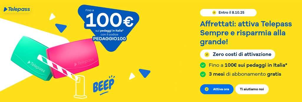 Telepass lancia la nuova promo dedicata a tutti i nuovi utenti: fino all’8 ottobre, attivando il piano Telepass Sempre, riceverai fino a 100 euro di cashback sui pedaggi in Italia, più 3 mesi di canone gratis – con tutti i servizi di mobilità inclusi. Se prendi spesso l’autostrada, questa promozione è l’ideale per risparmiare.