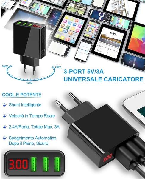 Avrai poi a disposizione ben tre porte USB A e questo ti permetterà di ricaricare senza troppi problemi fino a tre dispositivi. Il caricatore è inoltre conforme agli standard CE, CCC, FCC e ROHS e dispone della protezione multipla contro sovraccarico e cortocircuito. Previene infatti efficacemente possibili danni ai dispositivi carichi. Presenta poi un design elegante e compatto e questo lo rende adatto per qualsiasi contesto.