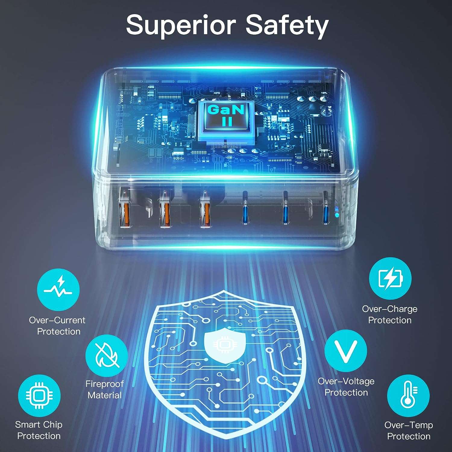 È in grado di sfruttare le 3 uscite USB-A QC 3.0 e le 3 uscite USB-C PD 3.0 per garantire una ricarica velocissima. E la tecnologia GaN offre una maggiore efficienza riducendo al minimo il calore generato. Integra una protezione da sovraccarico, surriscaldamento e cortocircuito. Potrai stare tranquillo che i tuoi dispositivi collegati non subiranno danni.