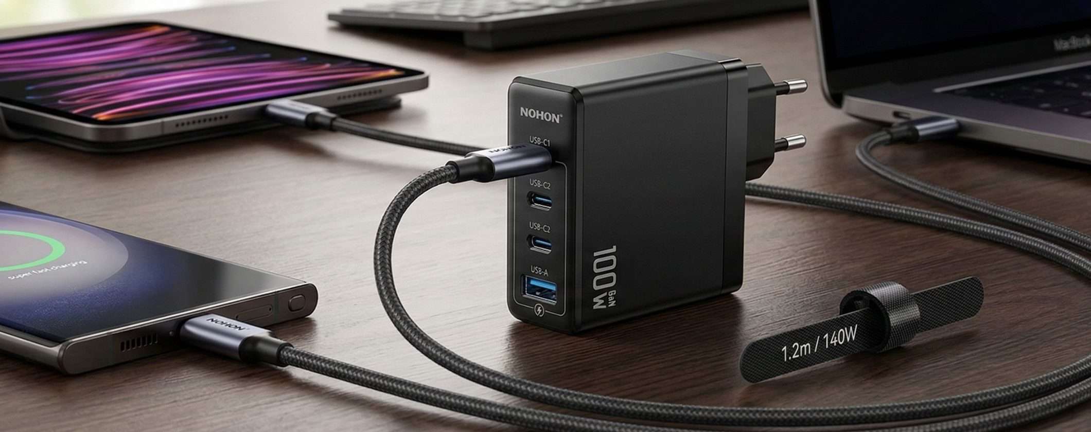 Questo alimentatore NOHON sfrutta la tecnologia GaN (nitruro di gallio), un’innovazione che permette di mantenere dimensioni estremamente compatte nonostante l’elevata potenza erogata. A differenza dei vecchi caricatori ingombranti, questo modello dissipa meglio il calore e occupa pochissimo spazio nella borsa o nello zaino. La configurazione a 4 porte, composta da 3 ingressi USB-C e 1 porta USB-A, permette di alimentare simultaneamente diversi prodotti come MacBook, iPhone delle serie più recenti e dispositivi Galaxy, gestendo in modo intelligente la distribuzione dell’energia per garantire a ogni dispositivo il massimo della velocità supportata.