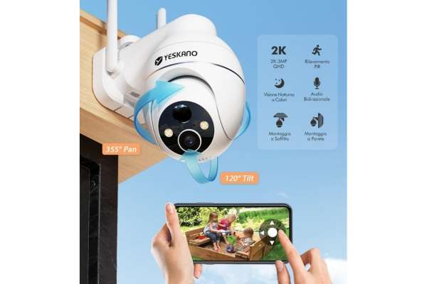 Gode di una qualità dell’immagine QHD 2K con colori dettagliati e una panoramica di 360°. Possiede un sensore di movimento PIR con intelligenza artificiale ed è dotato di luci LED che si attivano di notte per vedere al meglio. È resistente all’acqua e alle intemperie con certificazione di grado IP66 e quindi la potrai mettere all’esterno anche dove non c’è protezione. La potrai controllare con lo smartphone da remoto e puoi usare il microfono bidirezionale per comunicare con chi è nelle vicinanze.