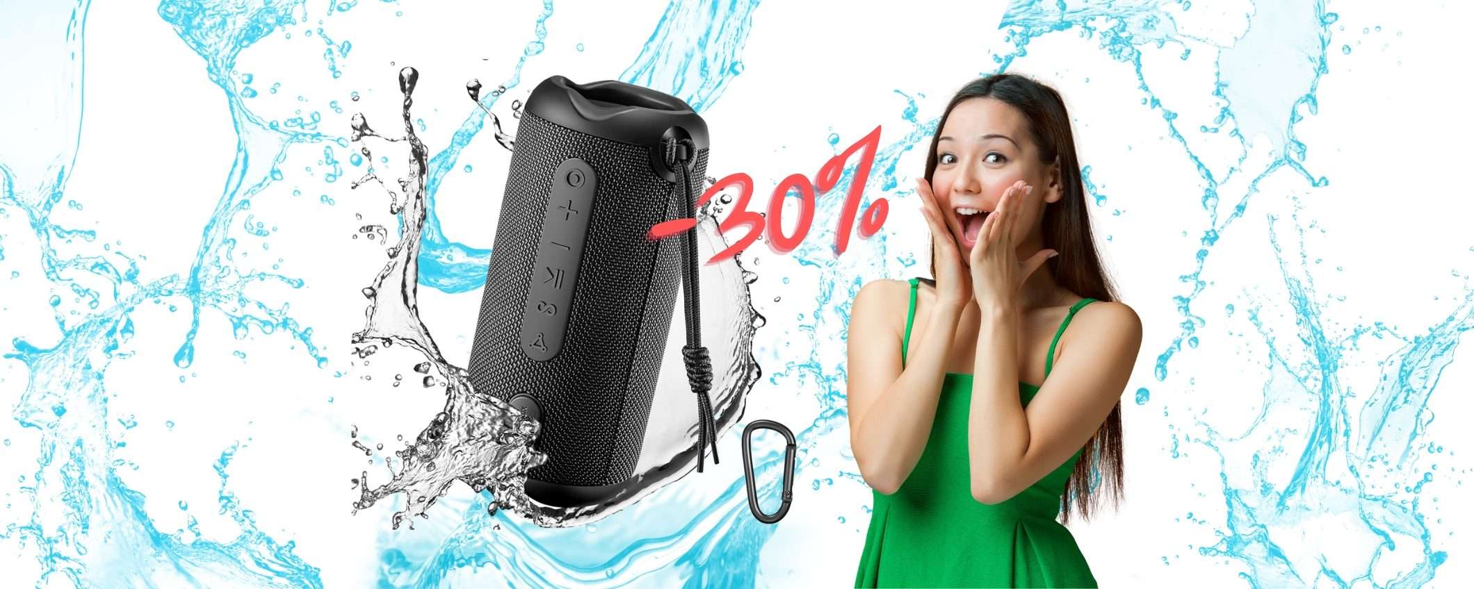 Goditi questo sconto del 30%, risparmia, e metti le mani su uno speaker portatile eccezionale. Offre un suono potente, si collega in modo veloce con i tuoi dispositivi ed è anche impermeabile. A un prezzo così basso è da prendere al volo.