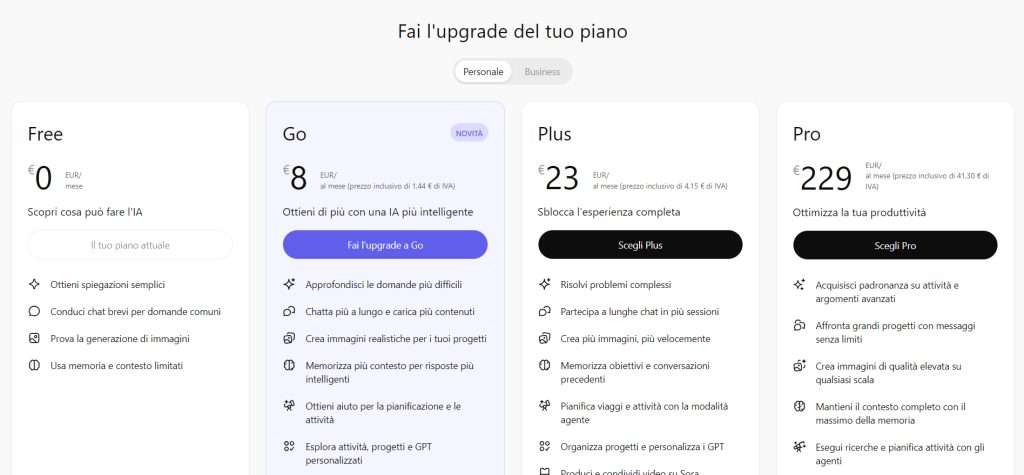 L’upgrade a ChatGPT Go risulta al momento già disponibile per gli utenti italiani, che potranno selezionarlo nella schermata riservata agli abbonamenti disponibili. Il costo, ricordiamo, è di 8 euro al mese.