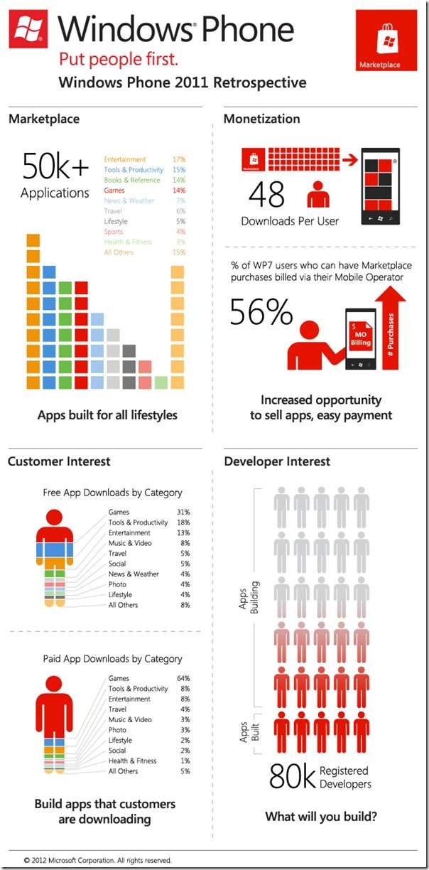L'infografica mostra anche che, nel 2011, su ogni telefono basato su Windows Phone 7 sono state scaricate in media 48 applicazioni. Interessante notare che questa media su Android è di 30 applicazioni mentre su iOS di Apple è di 83 app per utente.