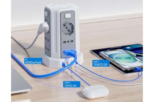 Ciabatta multipla a torretta con 12 prese e 4 USB
