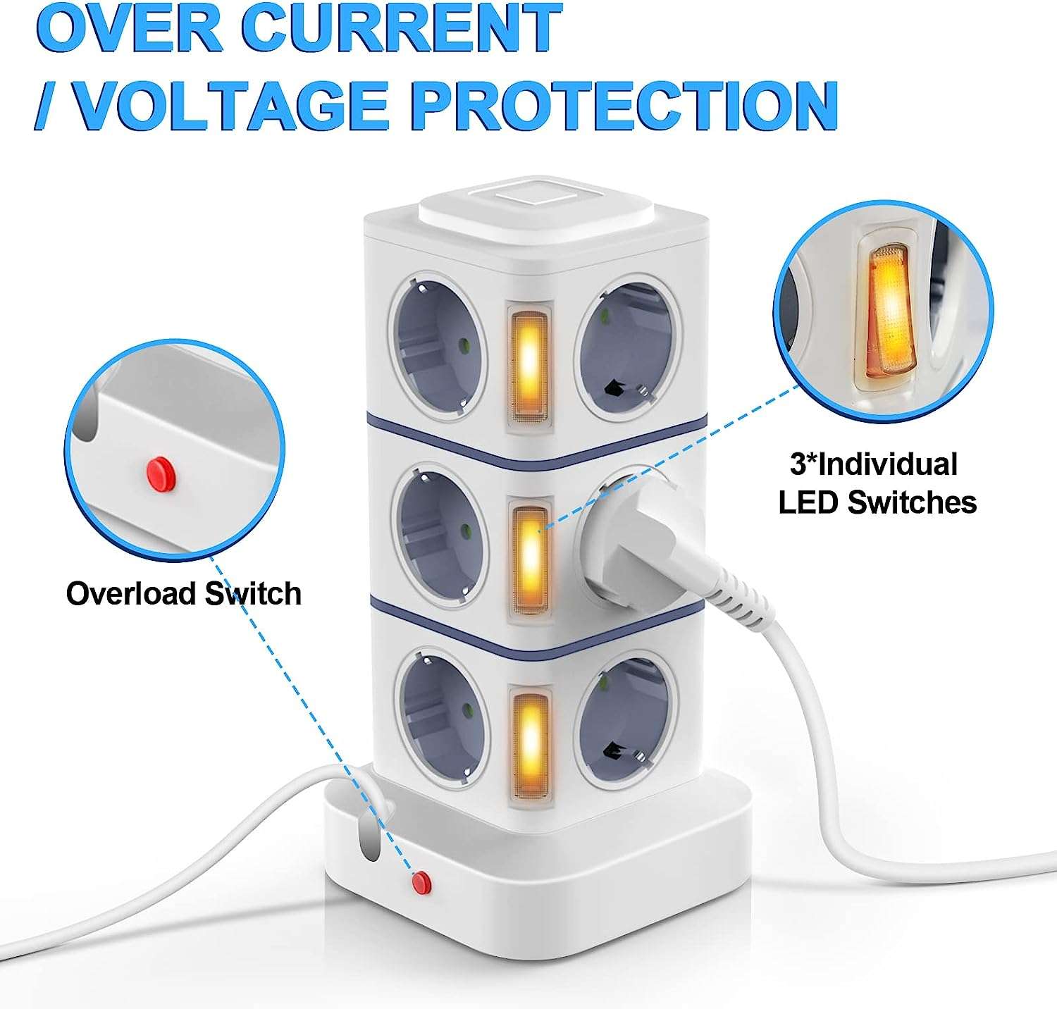 Ogni livello, formato da 4 prese, ha un suo interruttore individuale che quindi ti permette di accendere e spegnere tutte le spine che hai collegato senza doverle staccare per forza. Un LED ti indicherà quando sono in funzione. Ha un cavo della lunghezza di 3 metri che quindi si adatta perfettamente anche se la presa principale dovesse essere più distante. E poi è impermeabile e resistente alle alte temperature.